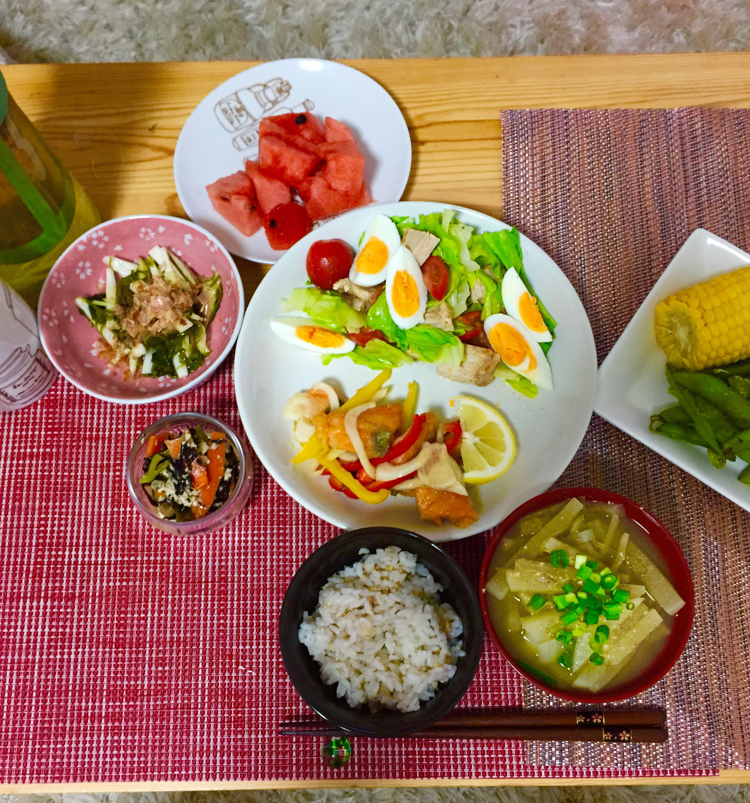 南蛮漬け、茗荷、枝豆、トウモロコシ、スイカ、食事も一気に夏になり、